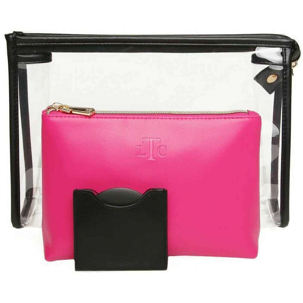 • 1 étui de voyage clair, 1 sac de maquillage zippé, 1 miroir compact à rond, marque London Train Company Branding