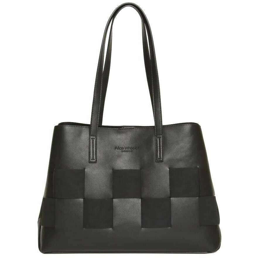 La créatrice Alice Wheeler London vous a apporté ce sac en faux cuir 100% végétalien pour femmes à l'aide de tons noirs. Il mesure 17 cm (hauteur) x 26 cm (largeur) x 12 cm (profondeur). Tous les sacs sont complets dans Alice Wheeler London Packaging. Le sac fourre-tout Alice Wheeler London Milan - Black fera l'accessoire chic parfait que vous voudrez apporter à tout événement. Son design de tissage élégant sur le devant est un beau détail qui attirera certainement l'attention des gens. À l'intérieur se trouve un double compartiment avec une section zippée intégrée, vous assurant que vous avez un espace pour vos objets de valeur ainsi que des compartiments avec un accès facile pour les effets personnels comme les effets de soleil ou le rouge à lèvres. Il peut également s'adapter à un petit ordinateur portable. Les poignées de double transport garantissent un transport facile, ce qui en fait une pièce incontournable.