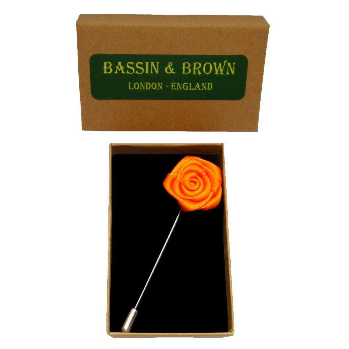 La fabrication du métal et du tissu plaquées du rhodium se trouve cette épingle à revers à fleurs roses pour hommes orange par le designer Bassin et Brown. Il mesure 8 cm (longueur). Toutes les épingles à revers sont complètes avec une boîte de présentation Bassin et Brown. L'épingle à revers à fleurs rose bassin et brune - l'orange est l'ajout idéal à toute veste de costume de gentlemen. La rose a été parfaitement fabriquée à partir de matériaux satin.