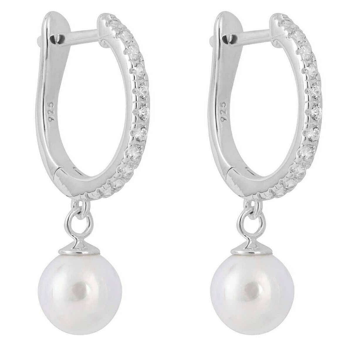 Les débuts pavé les boucles d'oreilles de cerceau de charme perl - argent / blanc
