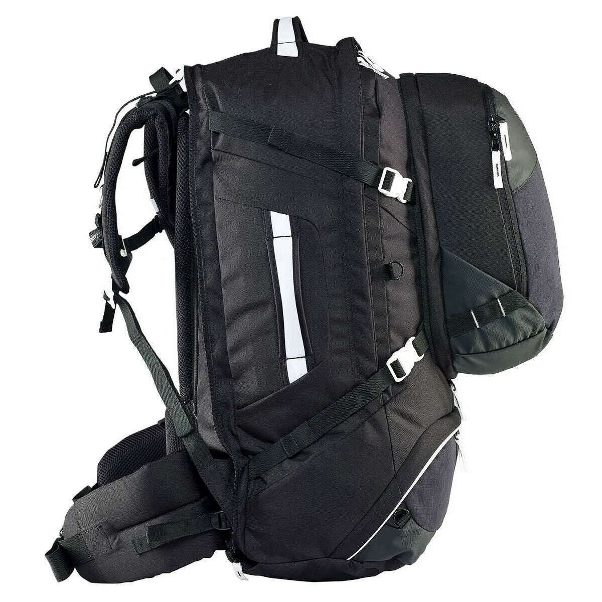 • Pack de jour multifonctionnel éteint éteint, système de harnais rembourré entièrement réglable avec courroie de hanche qui peut être zippé, couverture de pluie entièrement dissimulée, panneaux de base résistants à l'eau lourds, compartiment de chaussures de base séparé