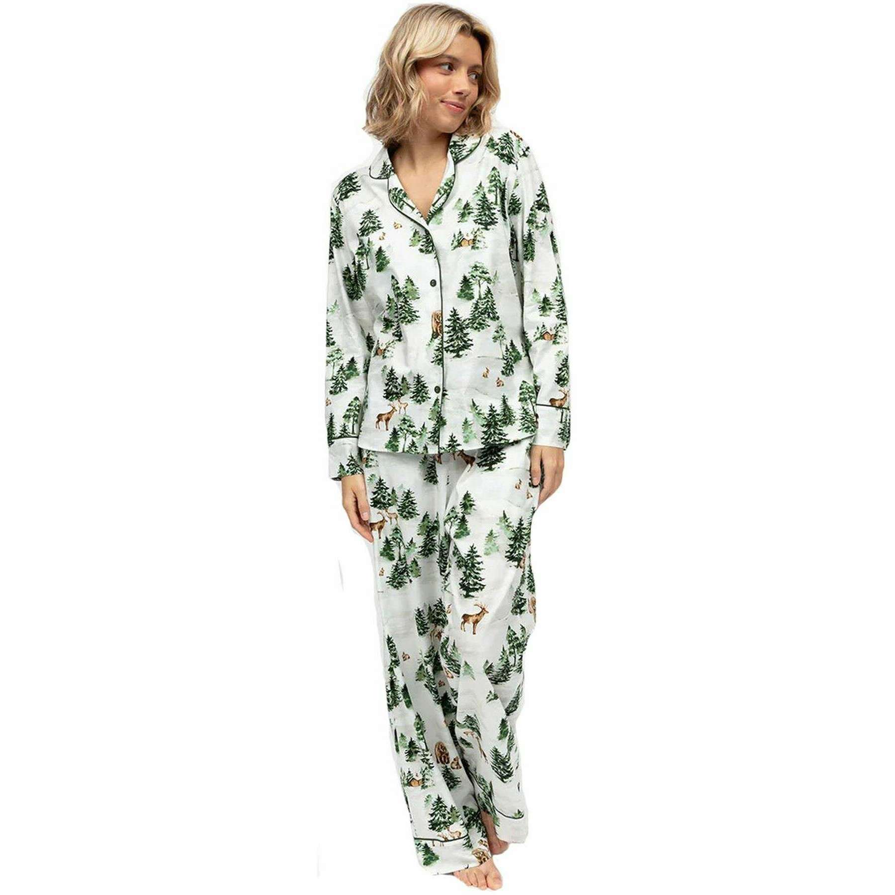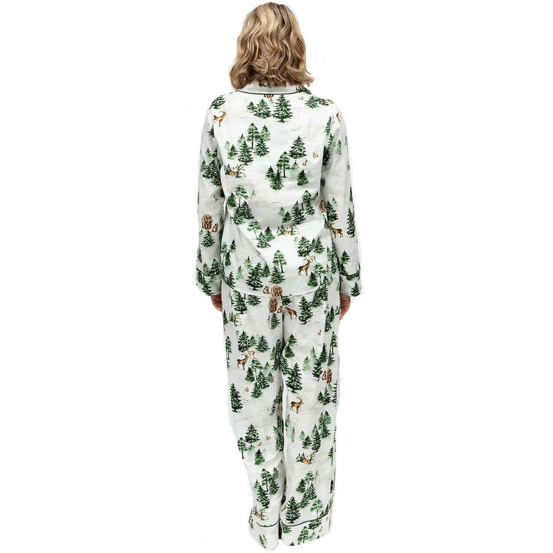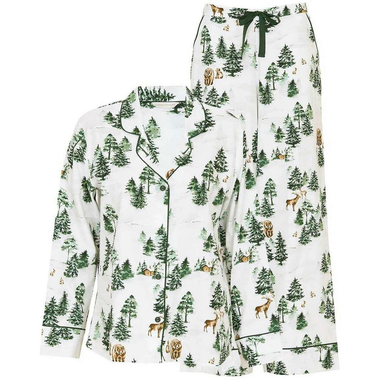 Cet ensemble de pyjama pour femme en jersey imprimé fougère alpine de la marque Cyberjammies est composé à 60% de coton et à 40% de modal et est présenté en vert. De plus, le pyjama vert olive/blanc est conçu avec un motif floral. Il est recommandé de le laver en machine à l'envers, de ne pas le tremper, de le laver avec des couleurs similaires pour garder ce pyjama en bon état. Tous les pyjamas sont livrés avec des étiquettes cyberjammies. L'ensemble pyjama en jersey à imprimé alpin Fern de Cyberjammies - Vert olive/Blanc apporte une ambiance hivernale douillette à vos temps d'arrêt. Fabriqué à partir d'un mélange doux de coton et de modal, cet ensemble présente un imprimé alpin serein de pins, de cabanes et d'animaux des bois sur un fond blanc éclatant. Le haut comprend un col à revers, un passepoil vert olive et des boutons recouverts pour une finition sur mesure, tandis que le bas à jambes larges offre un dos élastiqué, un devant plat, un cordon de serrage réglable et des poches latérales pour plus de confort et de facilité. Parfait pour les matinées festives ou les soirées détendues, cet ensemble allie le charme saisonnier au luxe de tous les jours.