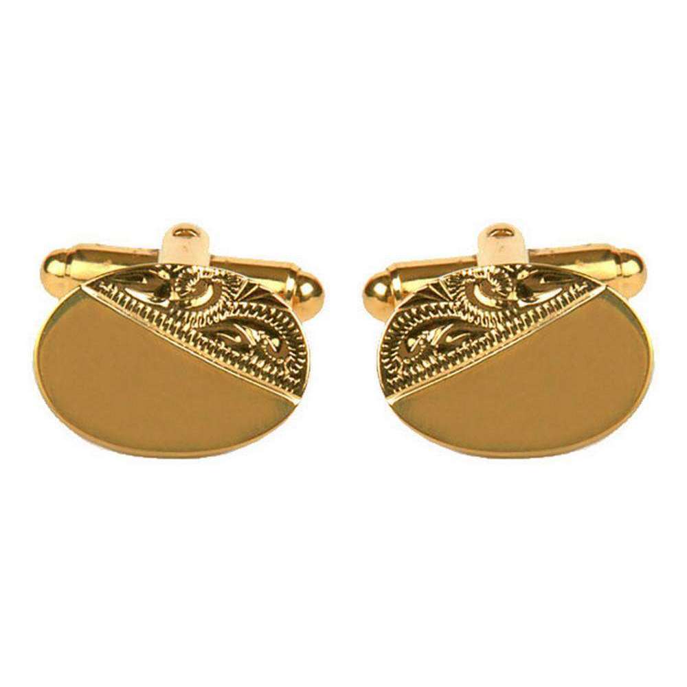 Superbement conçues dans une forme ovale classique, ces boutons de manchette gravés en or exquis de David Van Hagen ont été glorieusement fabriqués à partir de la plaque d'or de la plus haute qualité pour produire une finition durable. Doté d'un modèle gravé détaillé dans une partie des boutons de manchette, ces éléments ont des attaches en T-bar. Livrés dans une boîte de présentation de David Van Hagen, ces fantastiques boutons de manchette sont certains d'impressionner.