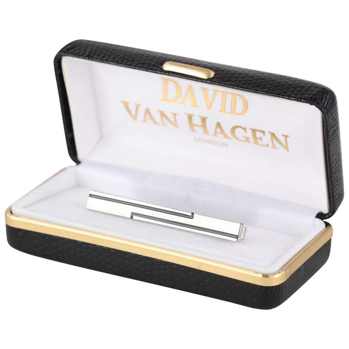 Cette diapositive de cravate simple mais élégante de David Van Hagen est l'accessoire parfait pour correspondre à la tenue intelligente. Avec des lignes d'encadrement noires, cette pièce est fabriquée à partir de rhodium de haute qualité. Cette diapositive de 5,6 cm x 0,6 cm de David van Hagen est un élément idéal pour un homme à la mode, garantie pour impressionner.
