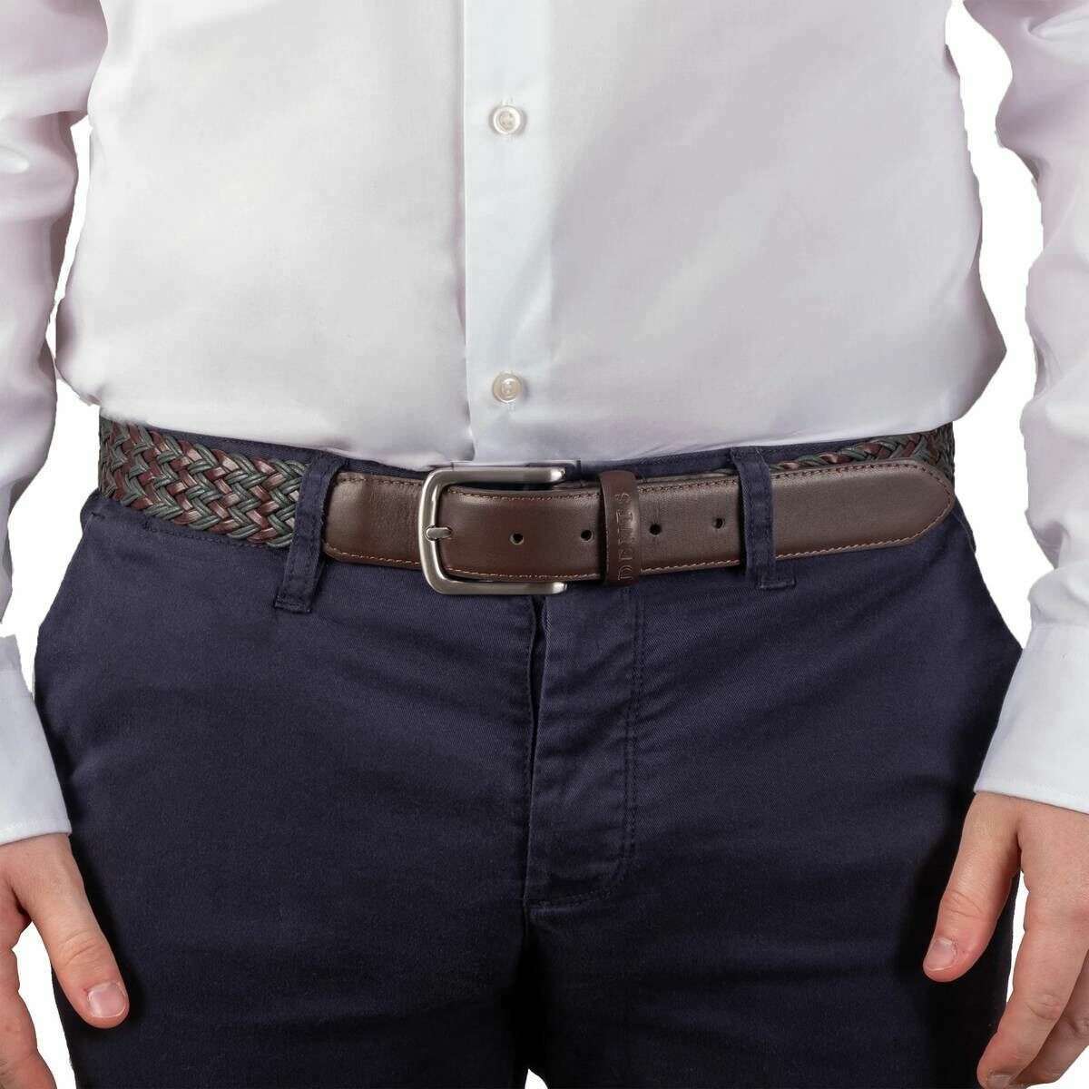• Tressé, extrémité en cuir, boucle carrée, passant en cuir unique, gaufré, 5 trous, largeur 3,5 cm