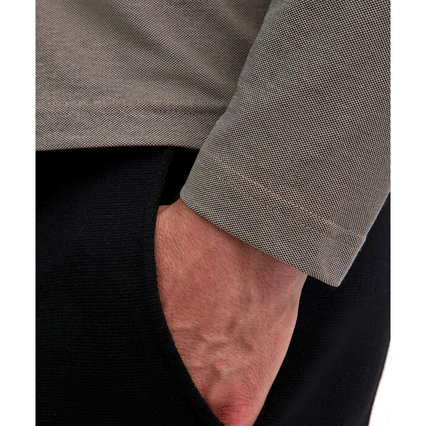 • Détail de rayures monochromes, résistant, patte à 3 boutons, texture piquée, coutures d'épaule décalées.