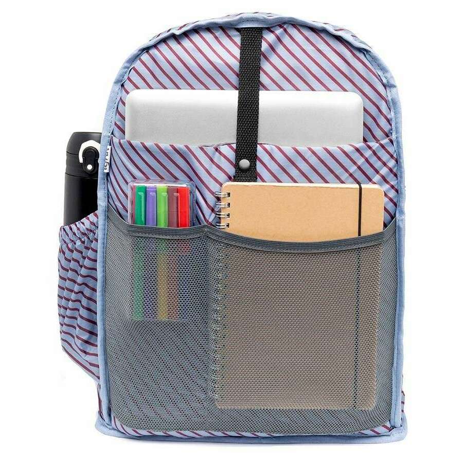 • Recyclé, durable, poche avant à glissière, poche latérale, fermeture instantanée, grand compartiment intérieur, manche pour ordinateur portable rembourré, plusieurs organisateurs, poche de bouteille, chariot Handel, poche à glissière arrière
