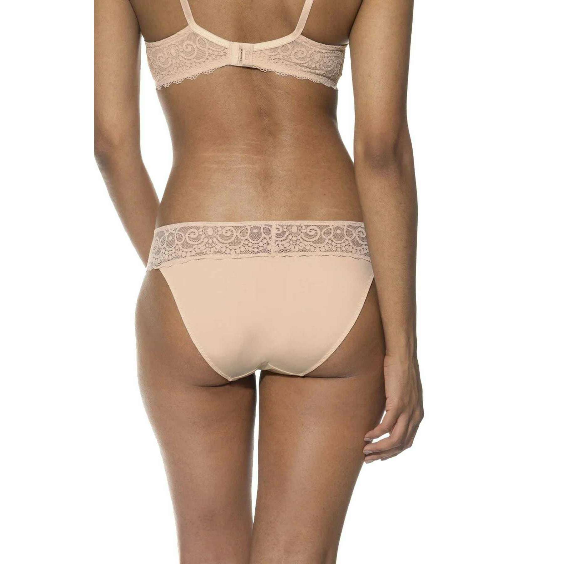 • Régisse médiane profonde, ceinture plate pour confort, insert en coton sur gousset, détail de la dentelle