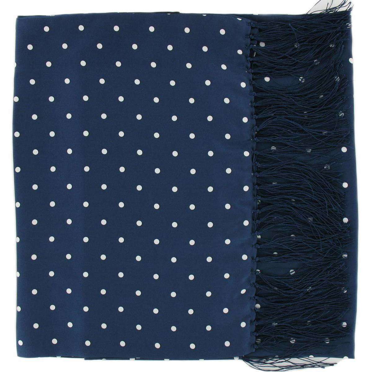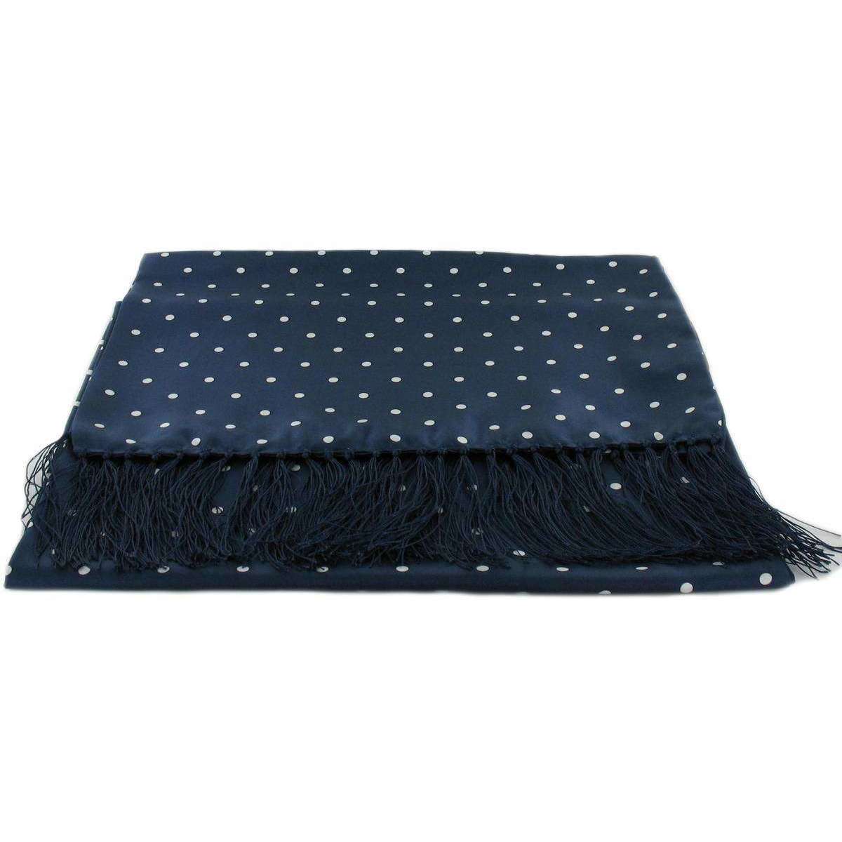This wide navy blue 100% pure silk scarf by the tasteful designer Michelsons of London has a fashionable polka dot design which makes the colour of the foreground stand out; not only does this elegant silk scarf look good it feels luxuriously soft. This stylish wide navy blue polka dot silk scarf is an ideal accessory to bring together an elegant outfit. This Michelsons of London silk scarf has unique hand knot tassels at each end making this scarf extra special.