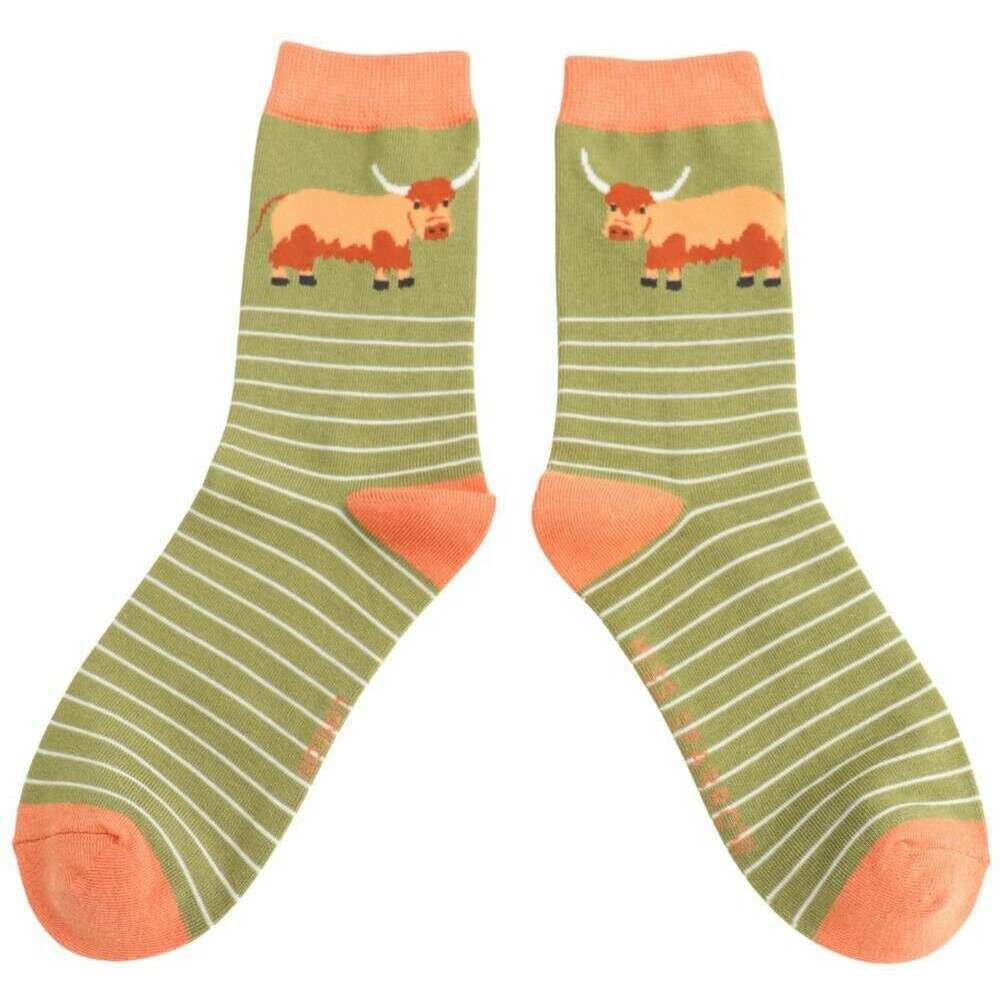 Chaussettes en bambou Miss Sparrow London Highland Cow and Stripes - Vert mousse