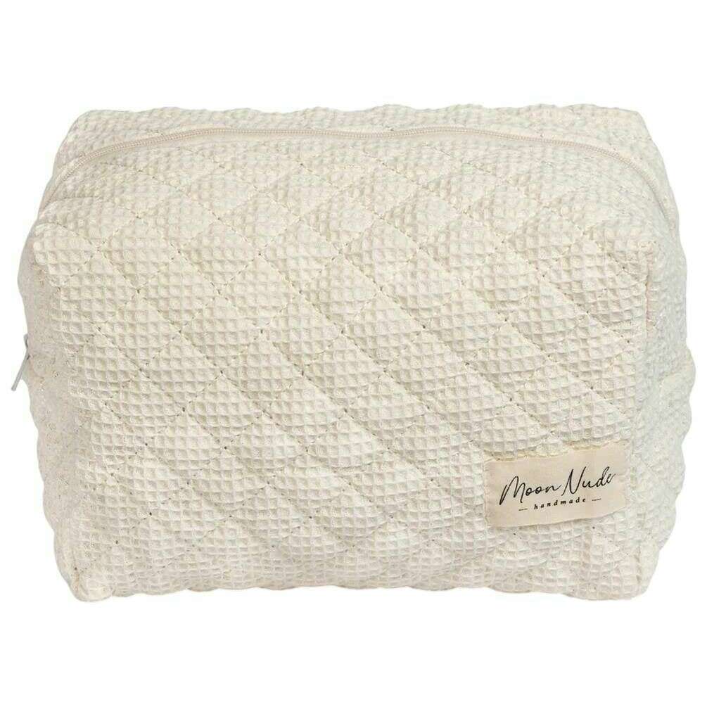 Cette grande trousse de maquillage crème pour femme du créateur Moon Nude est fabriquée à 100 % en coton. Il mesure 15 cm (hauteur) x 25 cm (largeur) x 15 cm (profondeur). Il est recommandé de laver à la main à l'eau froide avec un détergent doux, ou de laver à l'envers sur un cycle délicat. pour conserver ce sac en bon état. Tous les sacs sont livrés avec un emballage Moon Nude. La grande trousse de maquillage Moon Nude - Crème est une nécessité absolue pour votre chambre ou votre sac de tous les jours. Cette trousse de maquillage est garantie de garder tous vos produits les plus utilisés ensemble et en sécurité, tout en étant élégante et chic avec son design matelassé fait à la main.