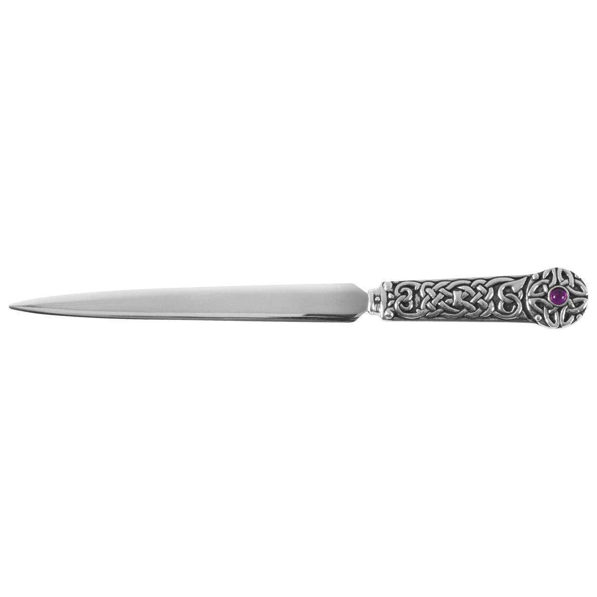 Présentant une conception celtique complexe, cette pièce se démarquera du reste. Prêter une attention étonnante aux détails, sa poignée a été terriblement décorée d'un motif celtique et terminée avec une pierre violette entrelacée dans le design complexe. Cet ouvre-lettre vous fournit un moyen sans effort de vous ouvrir soigneusement la lettre sans les problèmes habituels. Une collection essentielle pour vous et à venir dans un cas de présentation, il ne devrait pas être remarqué.