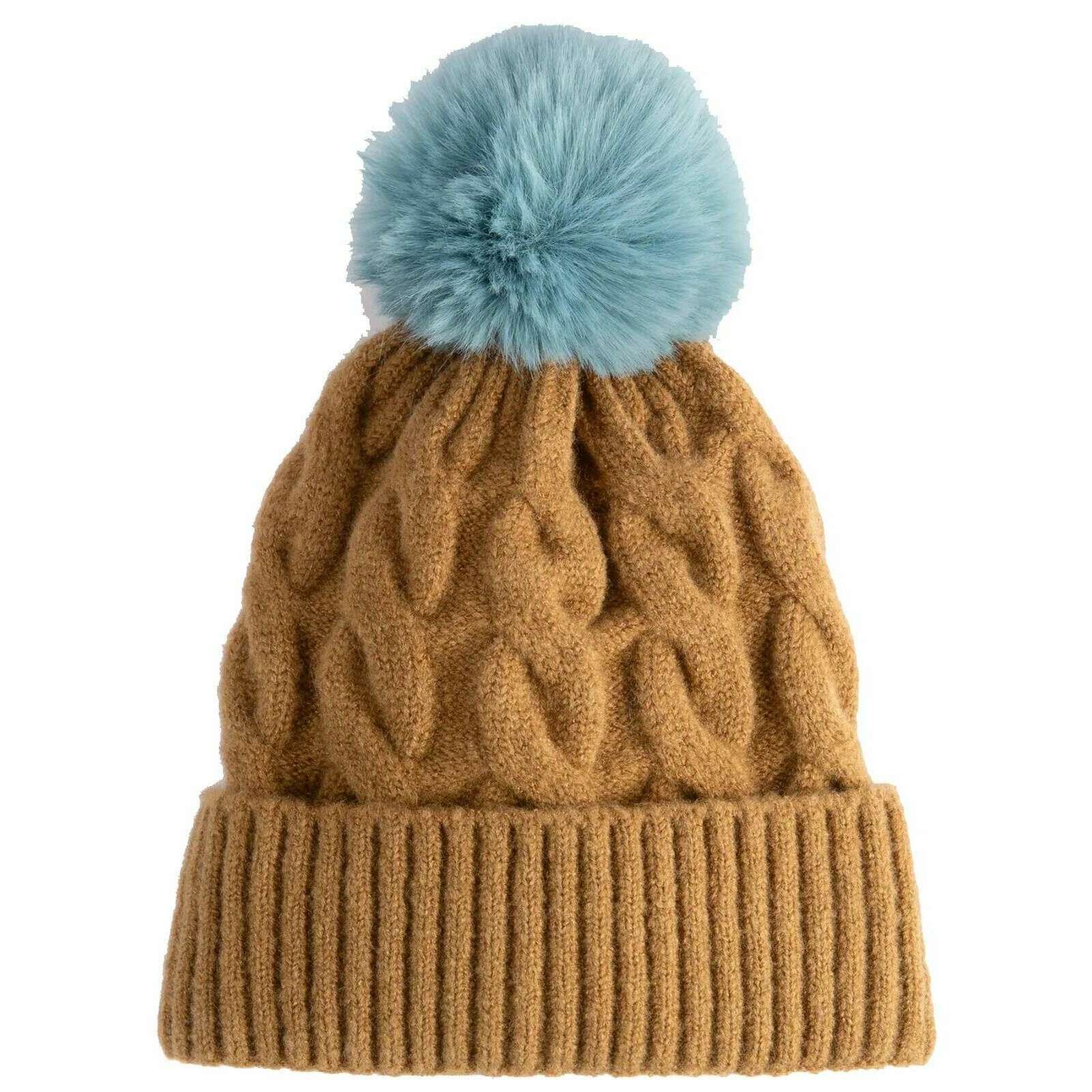 • Pom à fourrure en faux fourrure, gros tricot de style tresse, bande de retournement côtelée