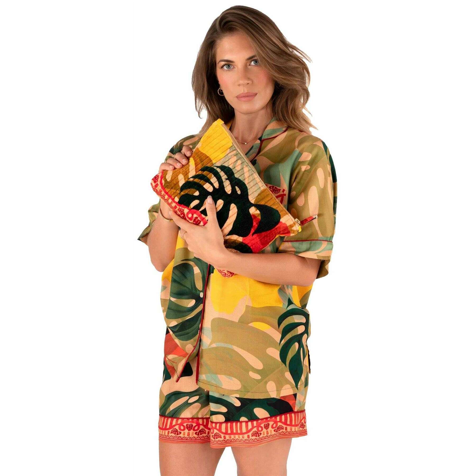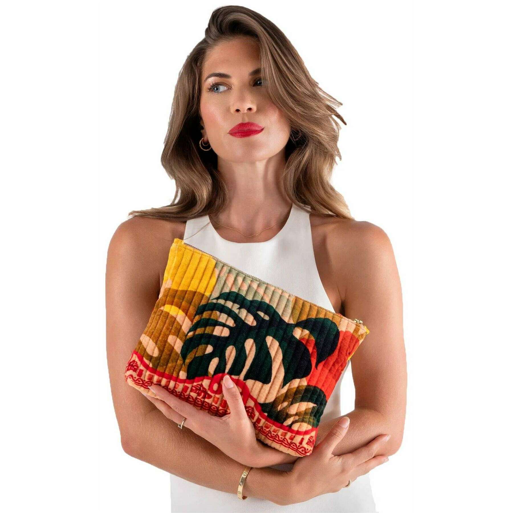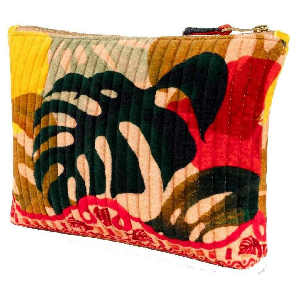Pochette Zippée en Velours Matelassé Feuilles Exotiques Poudre - Beige/Rouge/Noir