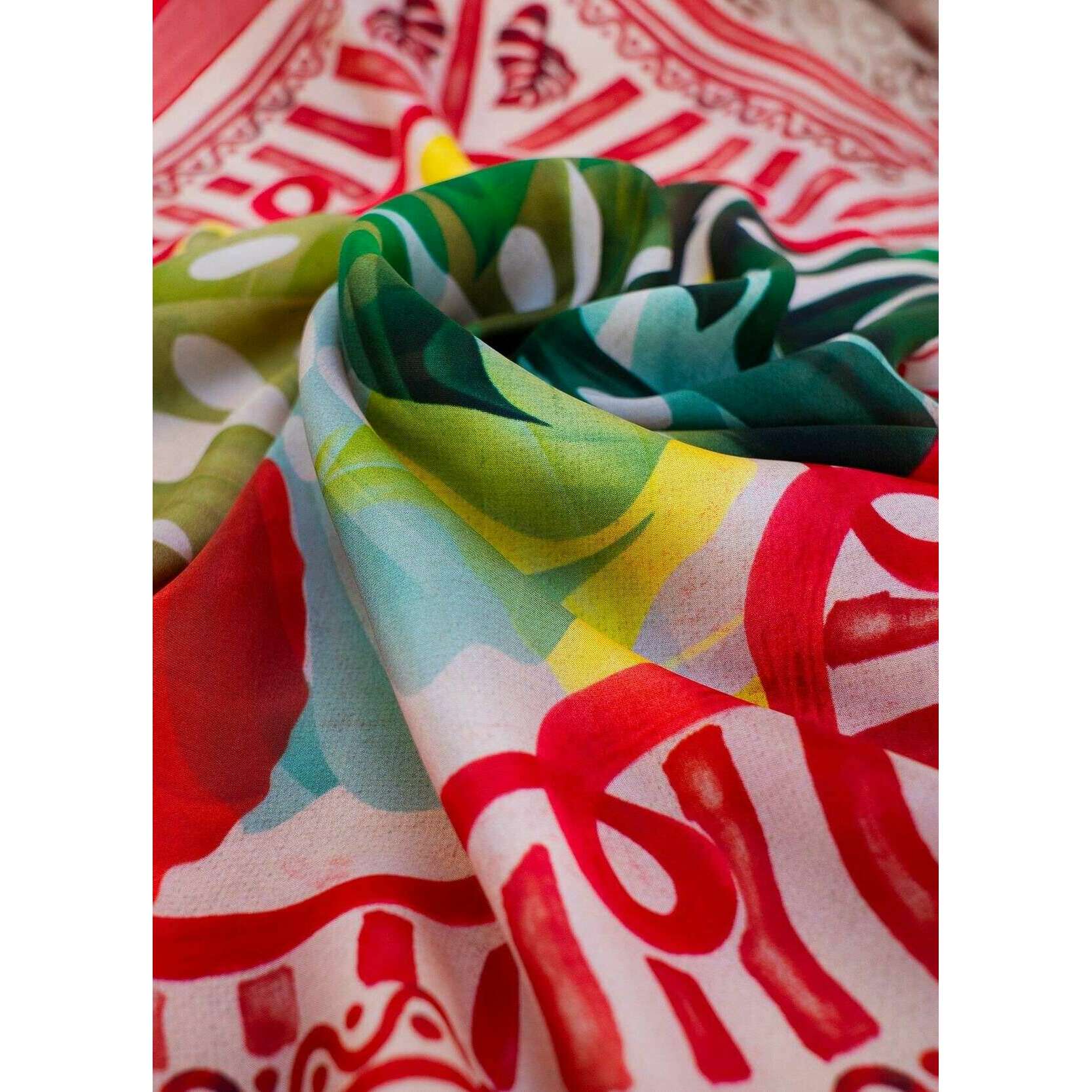 Foulard Carré en Soie Feuilles Exotiques Poudre - Rouge/Beige/Vert