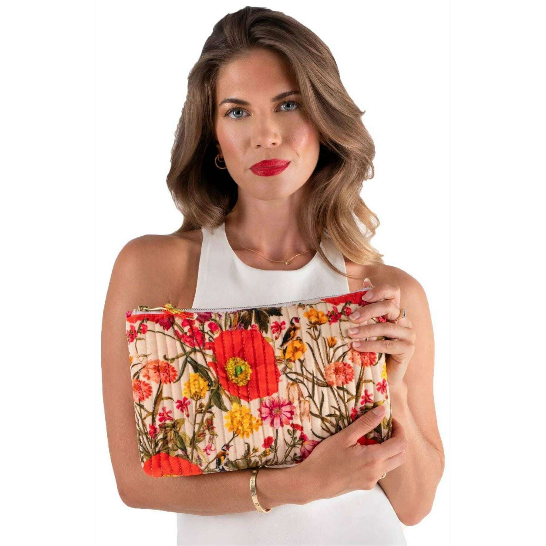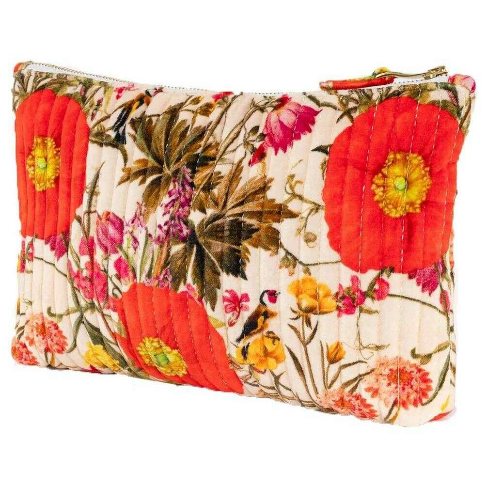 Pochette zippée en velours matelassé Powder Fine Flowers - Blanc/Rouge/Beige