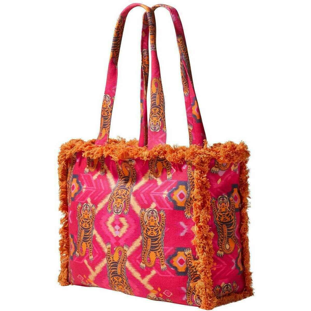 Ce fourre-tout à franges Ikat Tigers pour femmes est façonné par la poudre de marque de couleur rose et est fabriqué à 100% de coton. Tous les sacs sont livrés avec un sac cadeau en poudre gratuit. Le fourre-tout à franges à franges de poudre Ikat Tigers - Fuchsia Pink est un sac pratique et diversifié qui peut être utilisé pour les sorties quotidiennes, des voyages à la plage ou un pique-nique dans le parc. Le superbe détail marginal ajoute un flair intemporel, et les poignées de transport à double se font un transport confortable, que ce soit sur l'épaule ou à vos côtés. Cette pièce offre un stockage facile avec son compartiment ouvert dans lequel vous pouvez simplement jeter les choses et les extraire.