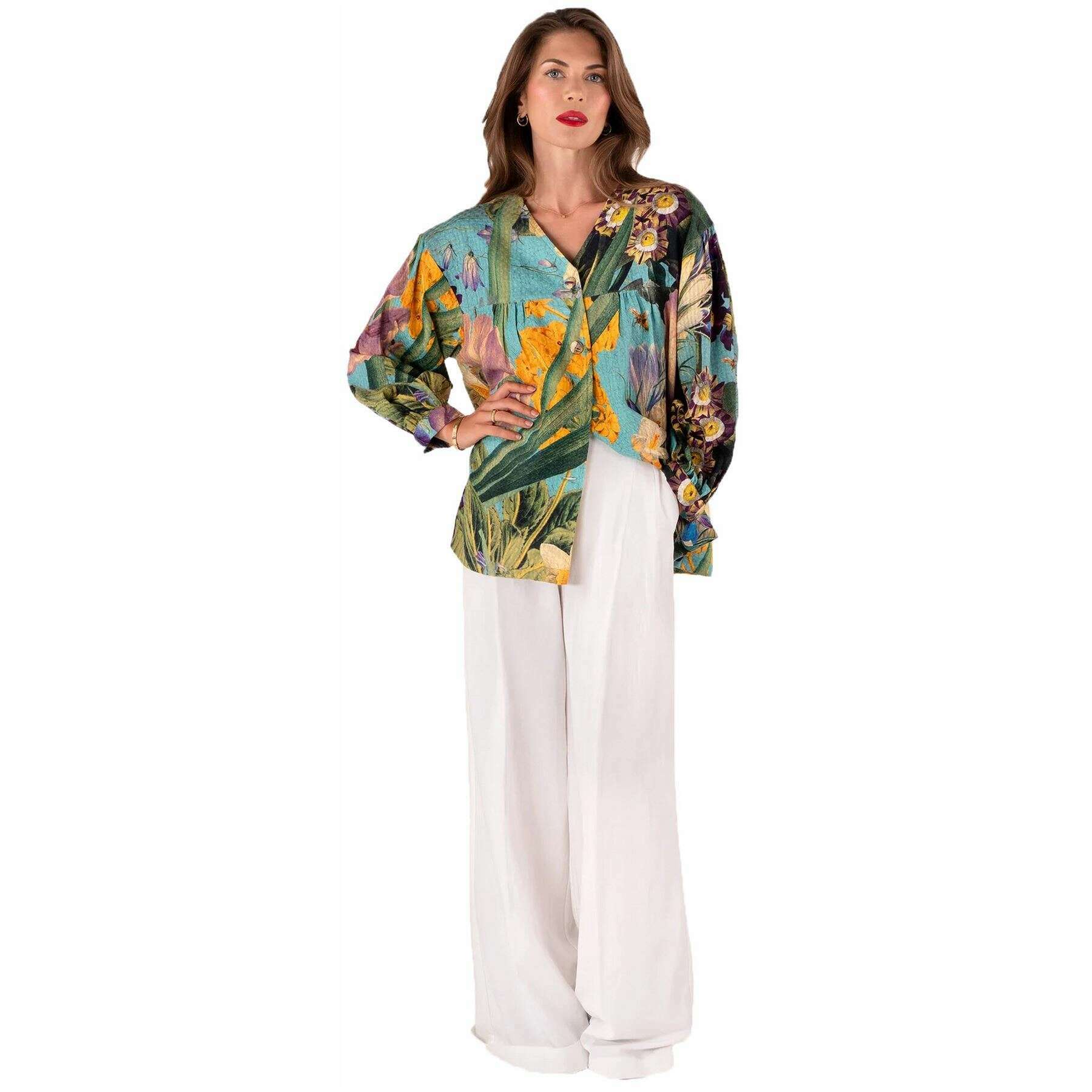 • Manches ourlées, boutonnée, col en V