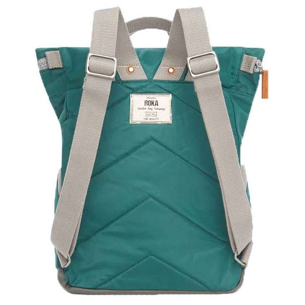 Manufactured from 100% weather resistant recycled nylon (triple coated) is this teal unisex canfield b medium sustainable nylon backpack by the designer Roka. It measures 42cm(height) x 30cm(width) x 12cm(depth). All the bags come complete with roka packaging. The Roka Canfield B Medium Sustainable Nylon Backpack - Teal is weather-resistant, durable, lightweight and sleek. Excellently crafted from recycled rPET materials, 12 or more plastic bottles are used to create this backpack making it environmentally friendly and sustainable. The roll top design enables the backpack to have a wide mouth opening which is secured with a sturdy zip and magnetic hold, carrying your essentials couldn’t be safer. Featuring a secret wallet pocket, a padded 15” laptop compartment, two side pockets perfect for water bottles, this backpack allows you to carry everything you may need on your day-to-day travels. Carry in complete comfort with the adjustable cotton webbing straps or the twin carry handles. This bag is completely vegan.