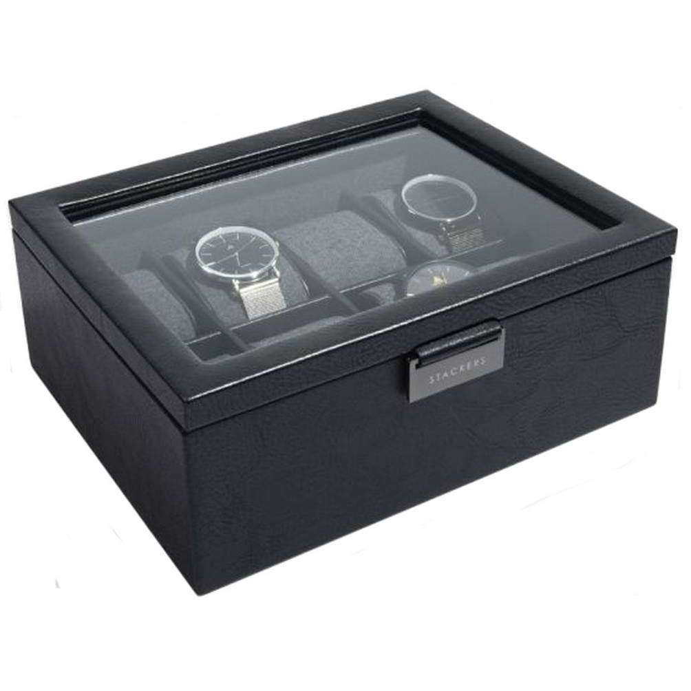 Perfect for men is this Stackers black 8 piece watch box, it is also made from leather and velvet. It measures 24cm(height) x 19cm(width) x 9.5cm(depth). All the gentlemen's boxes come complete in stackers packaging. The Stackers 8 Piece Watch Box - Black is ideal for keeping all of your watches in one place and exhibited inside of a smart box which stops them from collecting dust in a drawer when not being worn. Each of your watches can be strapped around a small cushion for attractive presentation. A must have for any gentleman's collection.