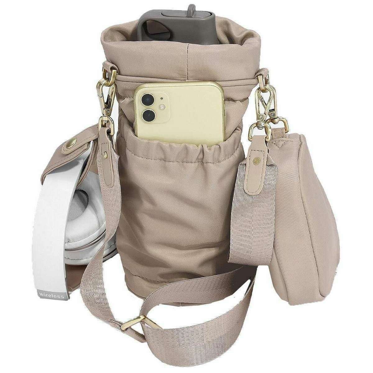 • Fermeture à cordon, sangle à bandoulière réglable, ligne de thermo-ligneuse, poche de téléphone arrière, pochette amovible latérale, sangle courte séparée pour fixer les écouteurs