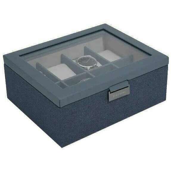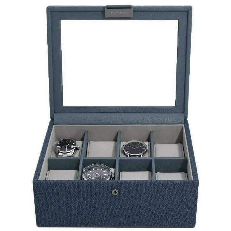 Présenté par les empileurs de marque, cette boîte de montre Blue Men's Canvas 8 pièces est fabriquée à partir de faux cuir et de toile. Il mesure 26 cm (hauteur) x 19 cm (largeur) x 9,8 cm (profondeur). Toutes les boîtes des messieurs sont complètes dans l'emballage des pilers. La boîte de montre de 8 pièces Stackers Canvas - Blue est idéale pour garder toutes vos montres en un seul endroit et exposées à l'intérieur d'une boîte intelligente qui les empêche de collecter la poussière dans un tiroir lorsqu'il n'est pas porté. Chacune de vos montres peut être attachée autour d'un petit coussin pour une présentation attrayante. Un must have pour toute collection Gentleman.