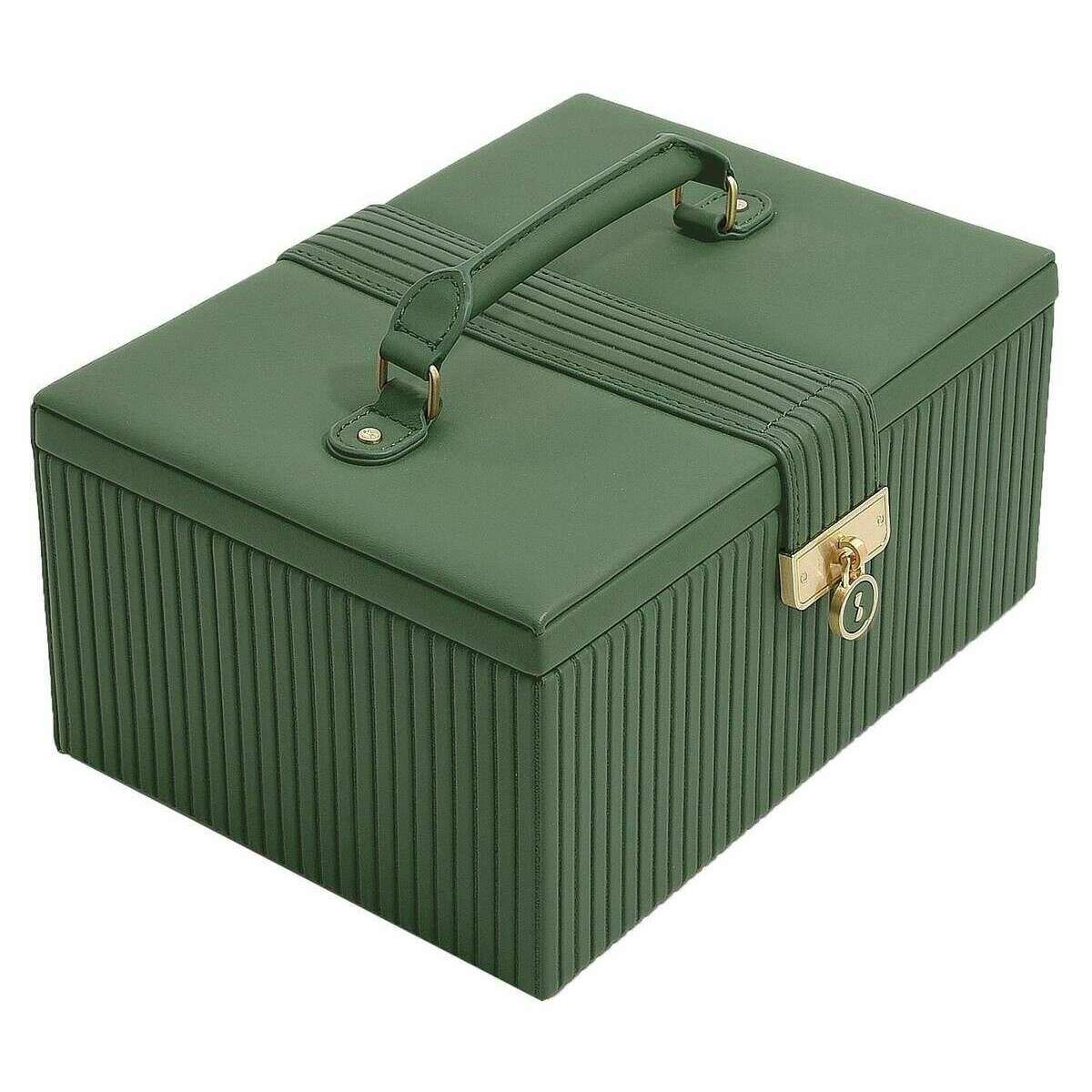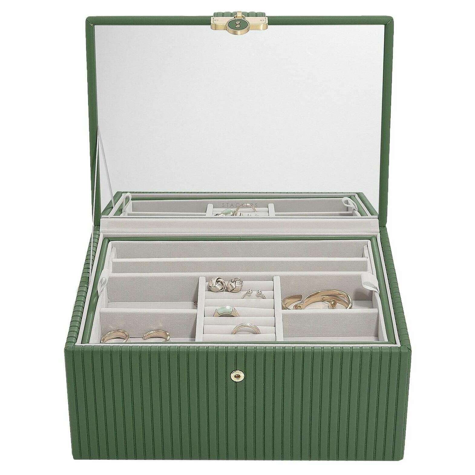 Cette boîte à bijoux classique pour femme a été fabriquée en simili cuir et en velours, de couleur verte et est de la marque Stackers. Il mesure 16,3 cm (hauteur) x 25 cm (largeur) x 18 cm (profondeur). Toutes les boîtes à bijoux sont livrées avec un emballage stacker. La boîte à bijoux Stackers Classic - Vert émeraude présente un magnifique design nervuré vert, donnant à cette boîte à bijoux un look élégant et sophistiqué. Complet avec des rouleaux pour bagues et boucles d'oreilles ainsi qu'une plus grande section en dessous pour les bijoux et accessoires plus gros.
