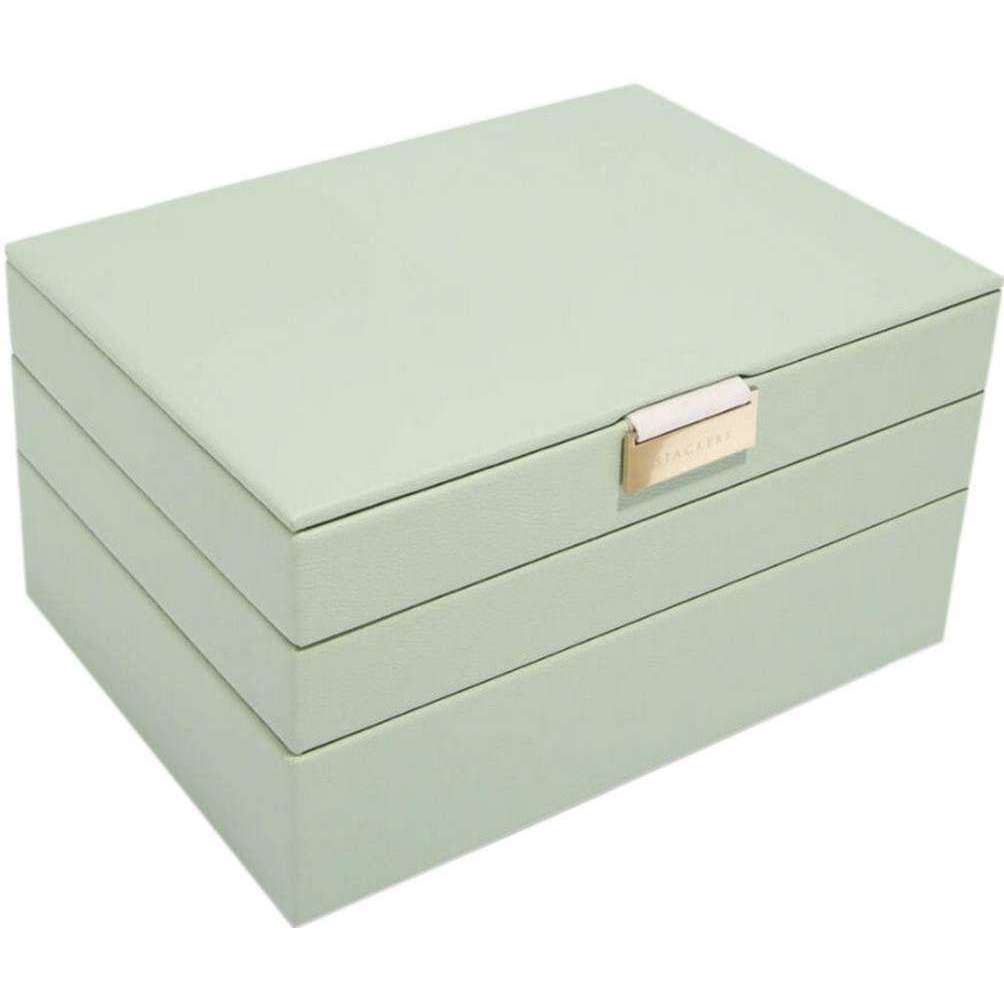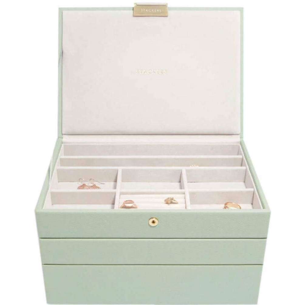 Brought to you by the brand Stackers, this sage green women's classic jewellery box is made from faux leather and velvet. It measures 25cm(length) x 18cm(width) x 13.7cm(depth). All the jewellery boxes come complete with stackers packaging. The Stackers Classic Jewellery Box - Sage Green is a dream come true for stylish women who love to accessorise thanks to the multi-layer design that has space for all types of accessories! Crafted from excellent quality materials, this box includes the jewellery box lid, trinket layer and watch/accessories layer and layers can be added or rearranged as you wish. A modern organiser that is practical as well as elegant.