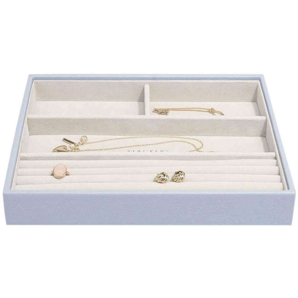 Brought to you by the brand Stackers, this lavender women's classic ring and bracelet tray is made from faux leather and velvet. It measures 25cm(length) x 18cm(width) x 3.7cm(depth). All the jewellery boxes come complete with stackers packaging. The Stackers Classic Ring and Bracelet Tray - Lavender offers you the option to stack this with other layers from the stackers collection to create your own custom jewellery box suitable for your needs. Alternatively, it can be used alone to organise your rings, bracelets and other small accessories. Expertly crafted with high quality materials, this lovely layer would be perfect for those who love to accessorise.