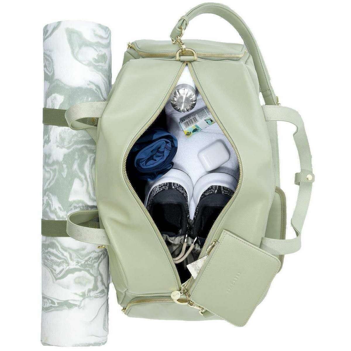 • Fermeture à fermeture éclair, sangle à bandoulière à bandoulière réglable détachable, 2 poignées de transport, sac à chaussures amovibles, plusieurs poches intérieures, porte-bouteille élastique, connecteurs de sangle de tapis de yoga rétractables dans la pochette à zip