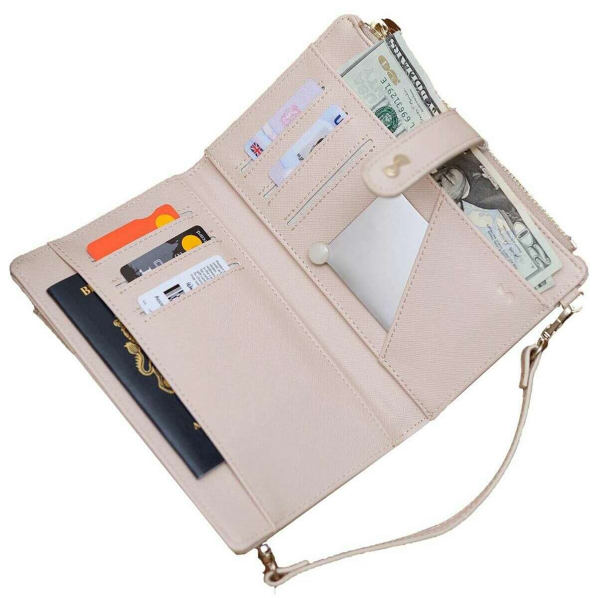 • Poche externe pour téléphone , 6 emplacements pour cartes , Miroir cosmétique , Poche à monnaie zippée amovible , Dragonne amovible , Fermeture à bouton-pression