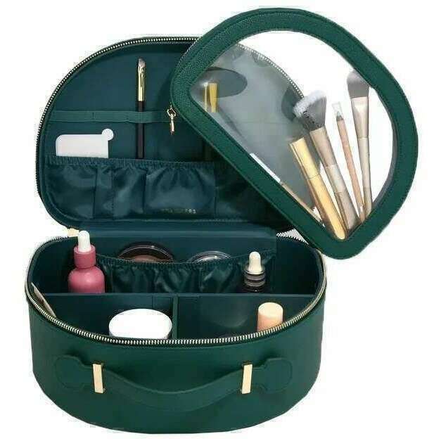 • Poignée, fermeture à glissière, boucles élastiques, poche élastique sur le couvercle intérieur, pochette transparente amovible, séparateurs internes, miroir inclus