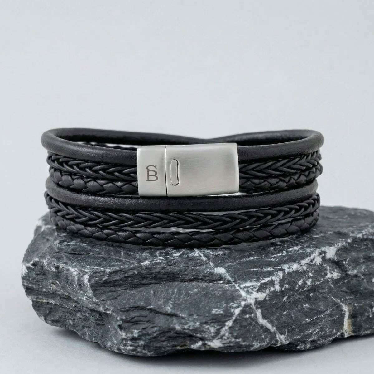Ce bracelet en cuir multi-rangs bonacci pour hommes de la marque Steel & Barnett est composé à 100 % de cuir de vachette et d'acier inoxydable et est présenté en noir. Tous les bracelets sont livrés avec un emballage en acier et Barnett. Le bracelet en cuir multi-rangs en couches Steel & Barnett Bonacci - Noir est une expression raffinée de savoir-faire et de style intemporel. Fabriqué à la main à partir de cuir de vache véritable de qualité supérieure, chaque brin est méticuleusement tressé pour créer une texture riche et superposée qui témoigne à la fois de qualité et de sophistication. Sa largeur de 12 mm offre une présence audacieuse mais polyvalente, ce qui la rend adaptée à un usage quotidien ou à des occasions élevées. Le bracelet est doté d'un fermoir en acier brossé, conçu en acier inoxydable 316L pour une durabilité et une résistance à la corrosion exceptionnelles. Sa conception à fermoir magnétique assure une fermeture sans effort tout en conservant un ajustement sûr et confortable tout au long de la journée. Élégant, durable et soigneusement conçu, le bracelet Bonacci est un accessoire remarquable qui complète le style moderne avec une touche classique.